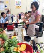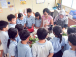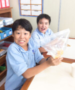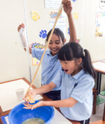 Finally, our young scientists enjoyed modelling the digestive system: ‘chewing’ the crackers in a bag with water, banana and orange juice, digesting the food in the plastic bag (stomach), moving into the intestines (a pair of tights) and excreting it into the bowl.